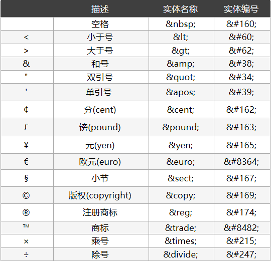 常用的字符实体名称与编号如下: